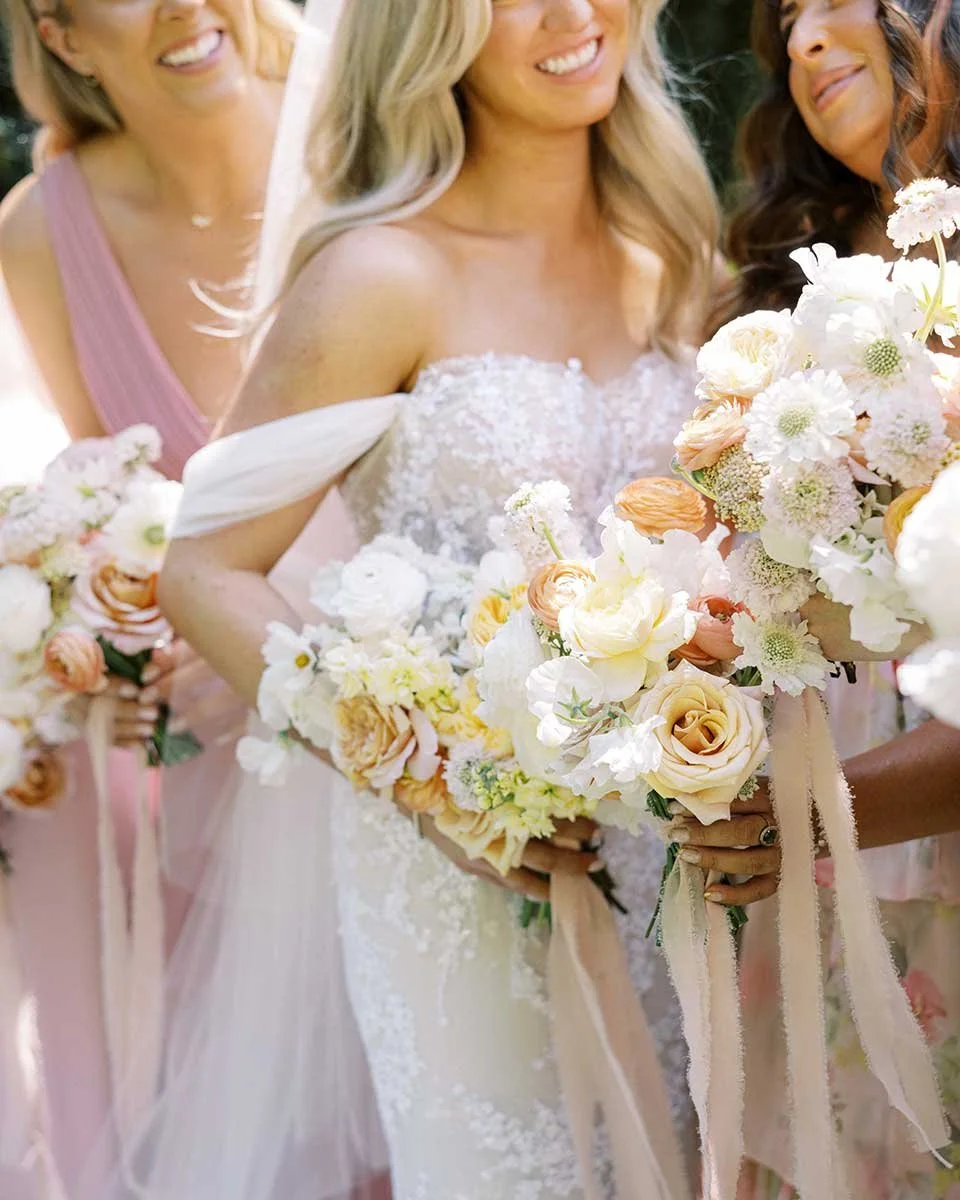 From the very first glance, Jennifer and Matthew’s wedding day embraced a garden party elegance that was both classic and timeless. Letterpress invitations tucked into blush envelopes set the tone, while his and hers vow books tied with pale pink ribbon added a heartfelt personal touch. The bride carried a stunning bouquet brimming with ranunculus, roses, cosmos, and flowing pink ribbons — just one of the many floral elements that contributed to one of the most aesthetically pleasing events we’ve seen.